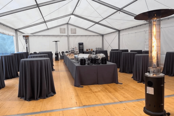 Dostępne jest bogate wyposażenie wewnętrzne namiotów, takie jak stoły i krzesła, parasole grzewcze, oświetlenie, sprzęt audio i wiele innych.
